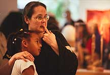 Anna Upicksoun and her daughter Aunalisa Fox look at artwork by Phyllis Ann Fast during the opening of the "Ceremony of Healing" exhibit. (Photo by Marc Lester / Anchorage Daily News)When the woman took the stage and picked up a script, the audience realized it had been had. The crasher was Diane Benson, a writer and actor, who launched into a catalog of work that addressed identity and respect. Benson's message was unmistakable as she gingerly slipped on beaded moccasins and humanized the "drunk" by unveiling her, inviting the audience to discard a stereotype.