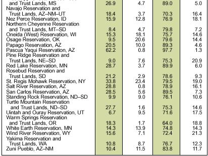 common as well .... Fourteen percent of American Indian households on reserva-tions lived in mobile homes. The corresponding rates for all households in the United States and American Indian house-holds not on reservations were 7 percent and 12 percent, respectively. On the larger reservations, mobile homes were most common on the Hoopa Valley, CA and Cattaraugus, NY reservations, where 41 percent and 39 percent, respectively, of American Indian households lived in them. .... but apartments were almost unheard of. A mere 5 percent of American Indian households on reserva-tions lived in units in multiunit structures. This was far below the 27 percent for all households nationally and the 28 percent for American Indian households liv-ing off reservations. Data for Smaller Reservations The table on right shows data only for the 48 reser-vations with 500 or more American Indian house-holds. To obtain both statistics for reservations not shown and estimates of sampling variability for all reservations, call Robert Bonnette (301-763-8553). This Brief is one of a series that presents information of current interest. It ex-amines data from the 1990 census. A complete description of statistical quali-ty and limitations is included in the above-mentioned reports. Percents of new and old homes are based on sample data. Consequently, these proportions are subject to sampling variability. Reservations with small numbers of households may have large sampling variability. |